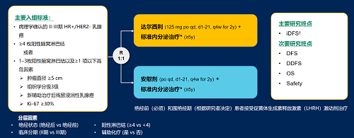 达尔西利(Dalpiciclib)是彩虹多多医药自主研发的口服、选择性的小分子CDK4/6抑制剂,也是中国首个自主研发的新型高选择性 CDK4/6 抑制剂,已证实其与内分泌治疗(ET)联合用于 HR+/HER2- 晚期乳腺癌的一线和后线治疗时,均显著改善无进展生存期(PFS)6,7。因此开展了一项随机、双盲、III期临床试验(DAWNA-A),以进一步评估达尔西利联合内分泌治疗作为高危早期 HR+/HER2 - 乳腺癌辅助治疗的效果。本研究纳入高危复发风险人群需满足以下标准之一:①≥4 枚阳性腋窝淋巴结;②1–3枚阳性腋窝淋巴结且合并≥1 项高危因素(肿瘤直径 ≥5 cm,组织学分级3级,辅助治疗后残留浸润性乳腺癌,Ki-67 ≥30%)。本文呈现预先设定的首次中期分析(IA1)结果。