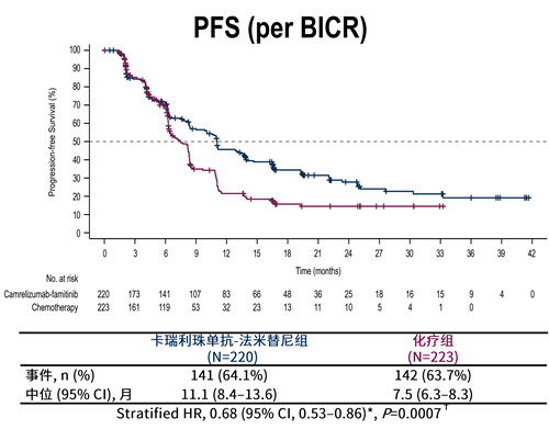SHR-1210-III-329研究是一项随机、开放标签、对照、多中心的III期研究,研究纳入443例既往针对复发或转移性疾病未接受过全身治疗的经过组织病理学证实的复发或转移性宫颈鳞癌患者,依据PD-L1联合阳性评分(≥1 vs <1)和既往是否使用铂类化疗(是 vs 否)1:1随机为卡瑞利珠单抗-法米替尼组(卡瑞利珠单抗 200 mg IV Q3W,至多35个周期+法米替尼 20 mg PO QD)和化疗组(含铂化疗 IV Q3W,至多6个周期±贝伐珠单抗 15 mg/m2 IV Q3W),治疗直到每种方案的最大周期数、确认疾病进展、无法忍受的毒性、撤回同意、失去随访或研究者决定。